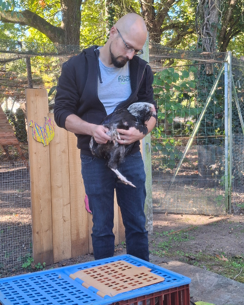 NĂ©es le 2 juillet 2025, les jeunes poules et coqs de race Faverolles ont Ă©tĂ© Ă©levĂ©es avec soin par Florian, qui sâest occupĂ© dâeux jusquâĂ ce quâils soient prĂȘts Ă rejoindre leur nouvel espace. Ce vendredi 17 octobre, six poules et trois coqs ont ainsi pris leurs quartiers au jardin.